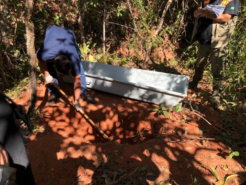 Foram acionados imediatamente a perícia técnica para exames no local e o IML. Os policiais e peritos cavaram o local, uma cova bastante profunda, e localizaram o corpo da vítima que estava com mãos e pés amarrados e a cabeça coberta com um pano. A vítima, aparentemente, não apresentava lesões causadas por disparos de arma de fogo.
