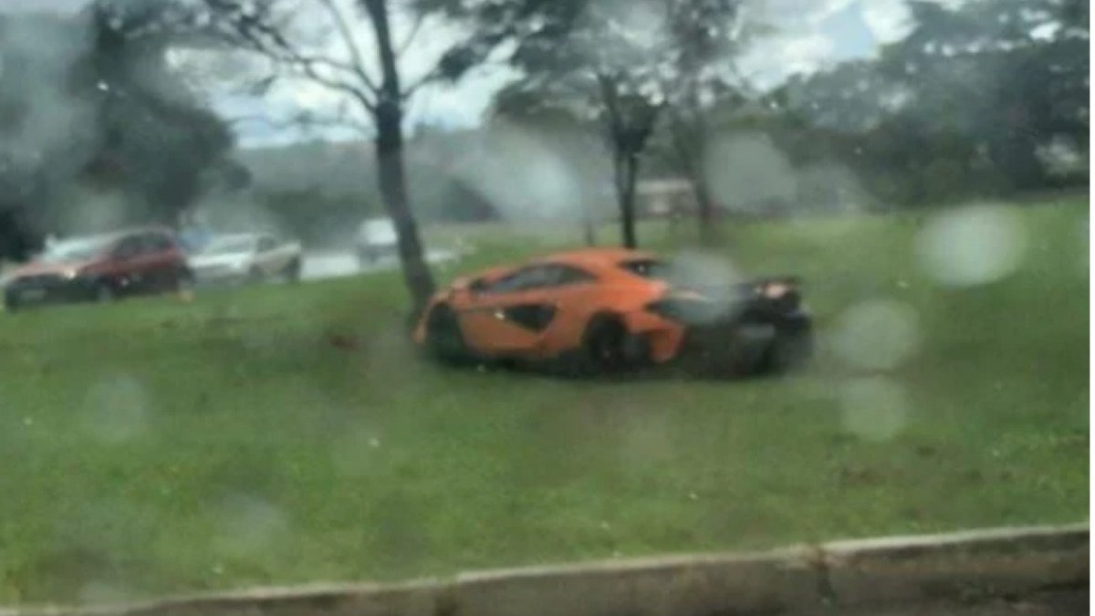 Imagens que circulam nas redes sociais mostram o carro, que pode chegar a custar R$ 3,5 milhões, amassado em canteiro do DF