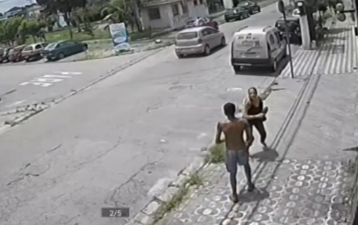 Uma mulher teve uma atitude inusitada durante uma tentativa de assalto no litoral paulista. Ela tirou o sapato e começou a bater em um dos criminosos, que chegou a levar pertences da vítima, os abandonando minutos depois. Os ladrões ainda não foram identificados.