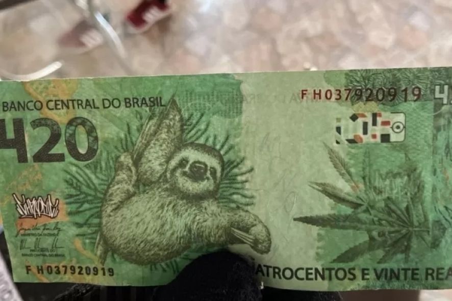 Uma planta de maconha e um bicho-preguiça foram estampados na nota, uma clara sátira, informou a PF. Do outro lado da cédula falsa, a efígie da República aparece soltando fumaça pela boca.