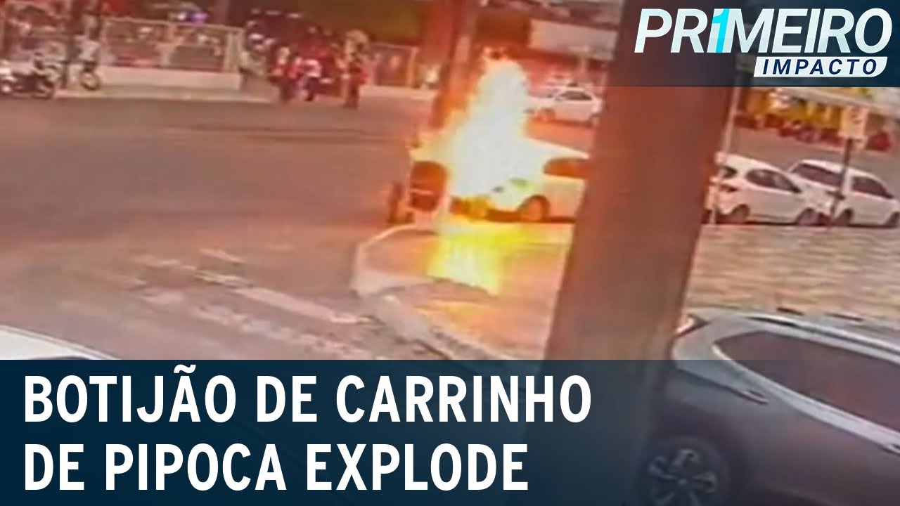 Um pipoqueiro que trabalha em Jaguaré, no Espírito Santo, se feriu quando botijão de gás do carrinho de pipoca explodir. Câmeras de monitoramento da rua flagraram o momento da explosão, que jogou o homem para trás. A vítima foi levada ao hospital e, apesar do grande susto, passa bem